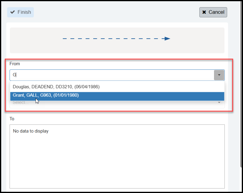 - Select the From Entity - the list populates from the Document's Entities list and is sorted alphabetically by Entity Type then Name/Title. Either scroll through the list or start typing the Entity's name to find.
