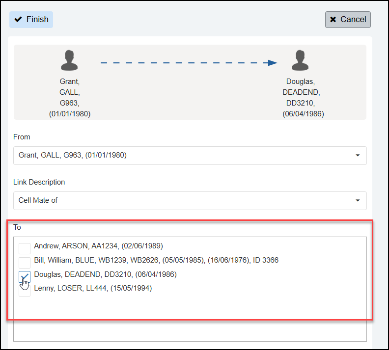 The related Link type group heading label shows when hovering or mousing over a Link description. - Select the 'To' Entity - this list will populate the Entity Types dependent on the Link description selected.