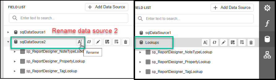 To configure parameters - on the main Report Designer page select the data source Fields icon from the far right menu.