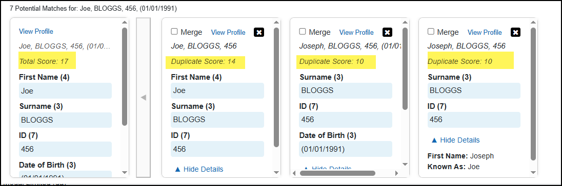 - Potential duplicates are ranked and displayed based on the highest score of their duplicate property values.