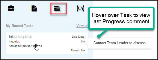 View Task progress comment; the last progress comment added to a Task, can now be easily viewed by hovering over the Task in the My Recents Tasks list.